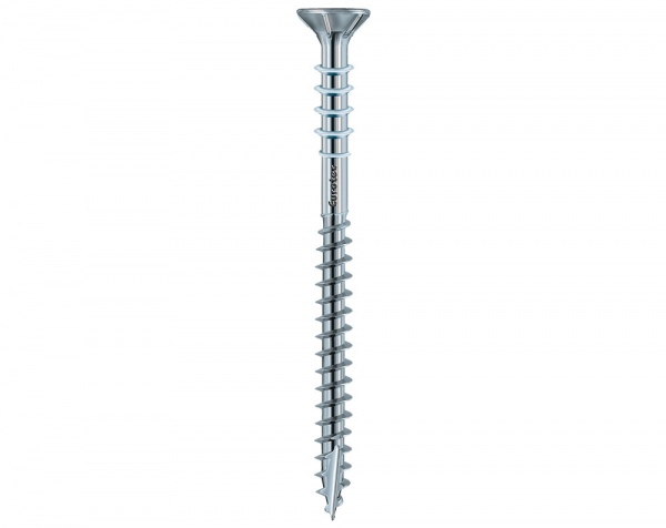 Die Justitec-Schraube besteht aus gehärtetem, verzinktem und gleitbeschichtetem Kohlenstoffstahl und verfügt über eine Schabenut an der Schraubenspitze und einen Senkkopf.